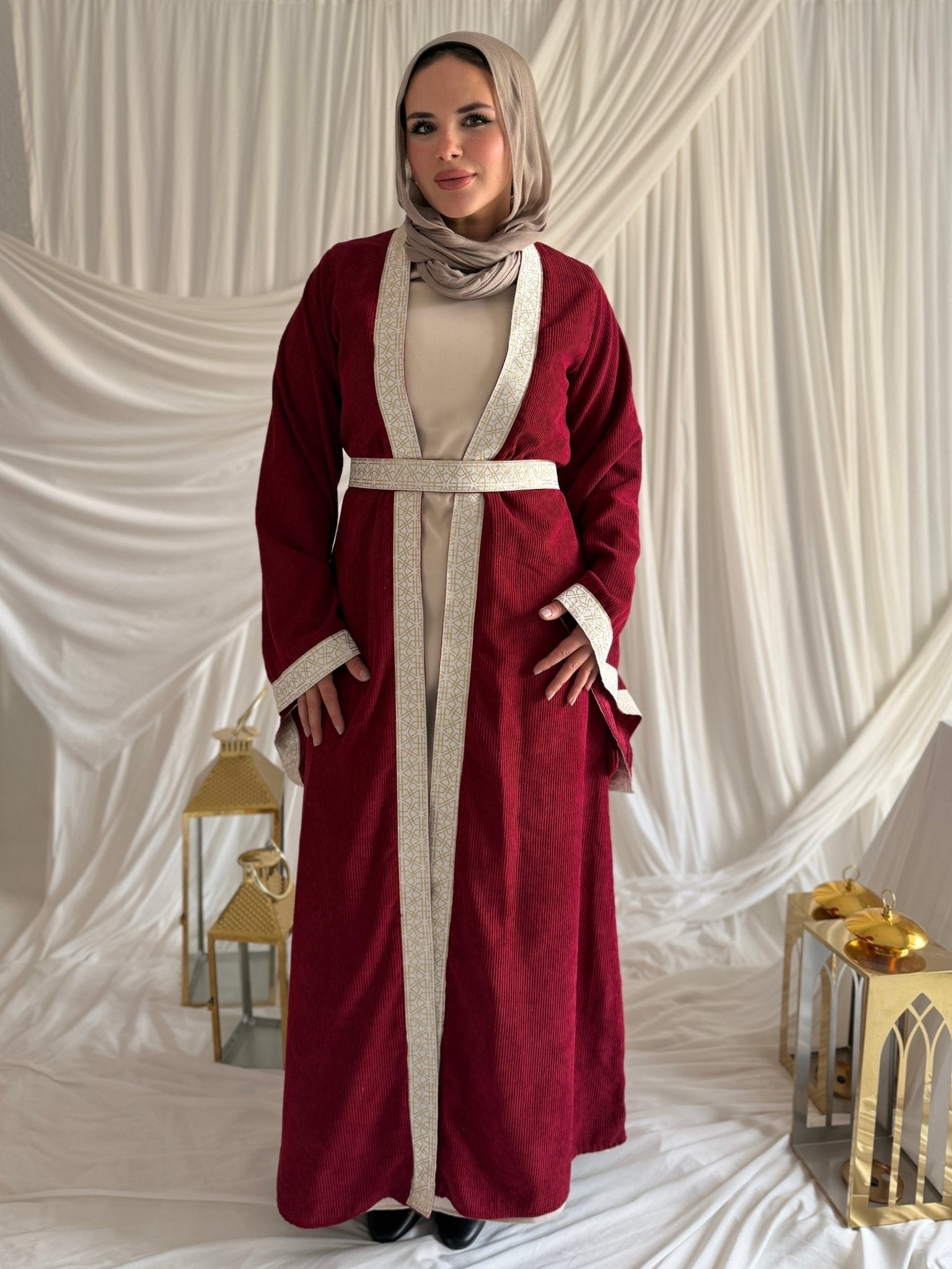 • Ribbed Velvet Kaftan: Crafted from high-quality ribbed velvet for a luxurious texture.